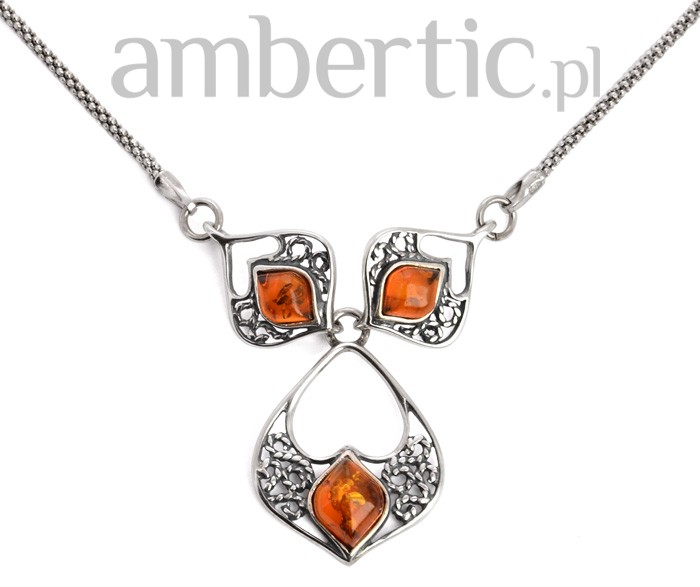 Przyjrzyjmy się ażurowemu wisiorowi z koniakowym bursztynem: