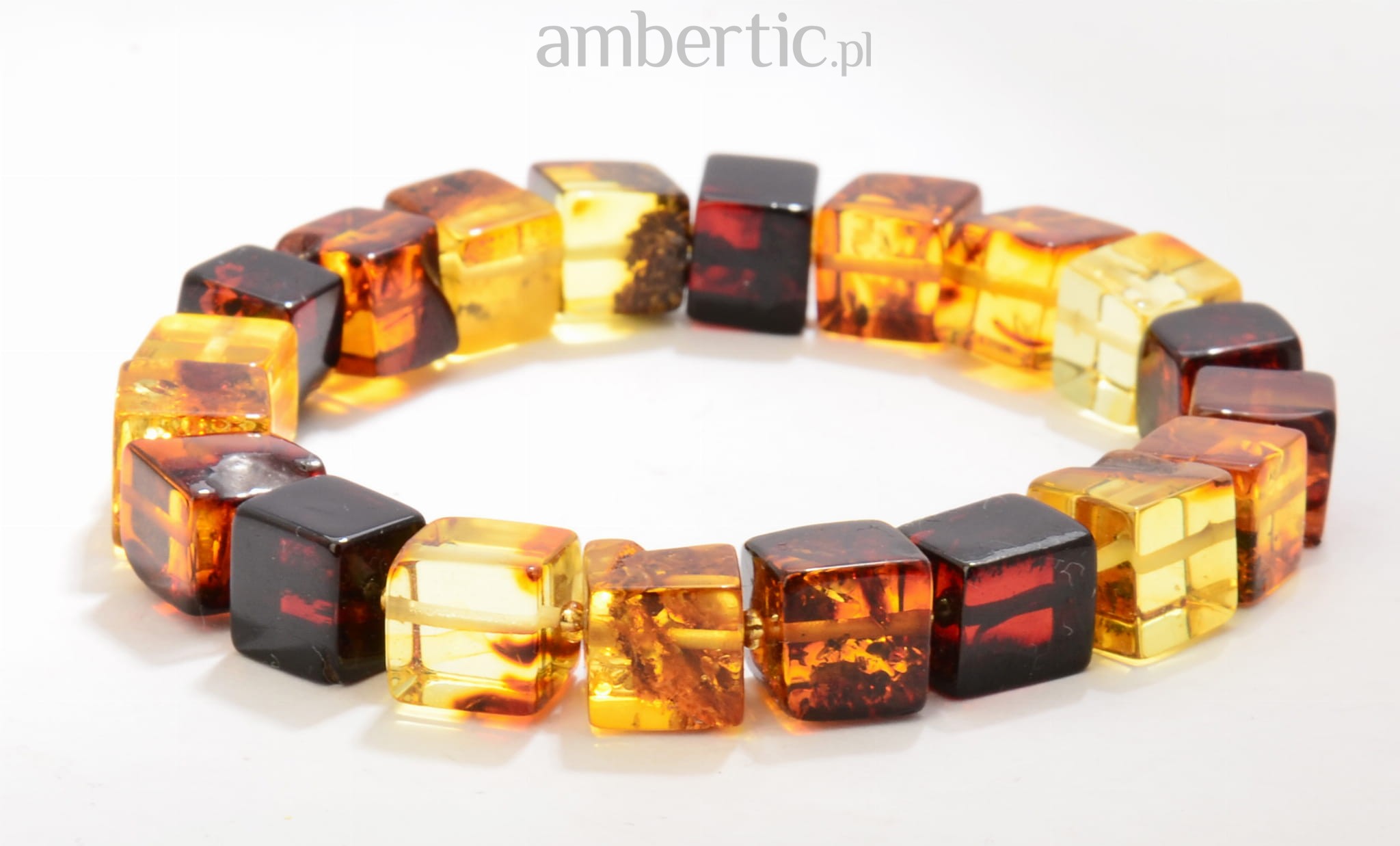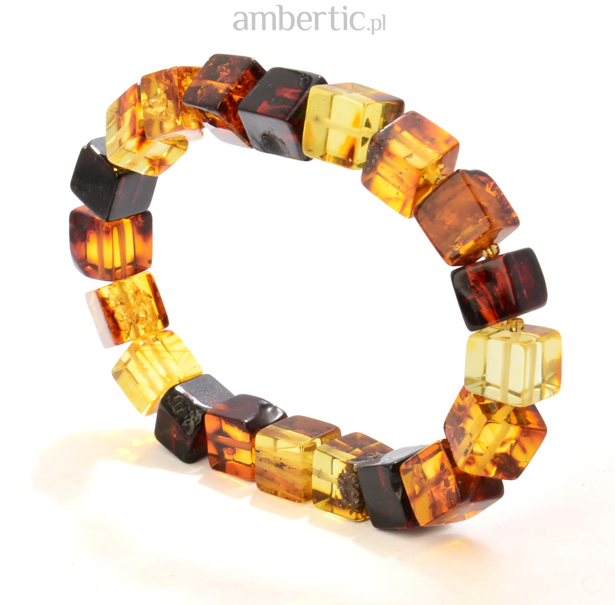 Przepiękna, niezwykle oryginalna bransoleta wykonana z szeregu starannie oszlifowanych kostek bursztynu w kolorach: wiśniowym, cytrynowym i koniakowym.