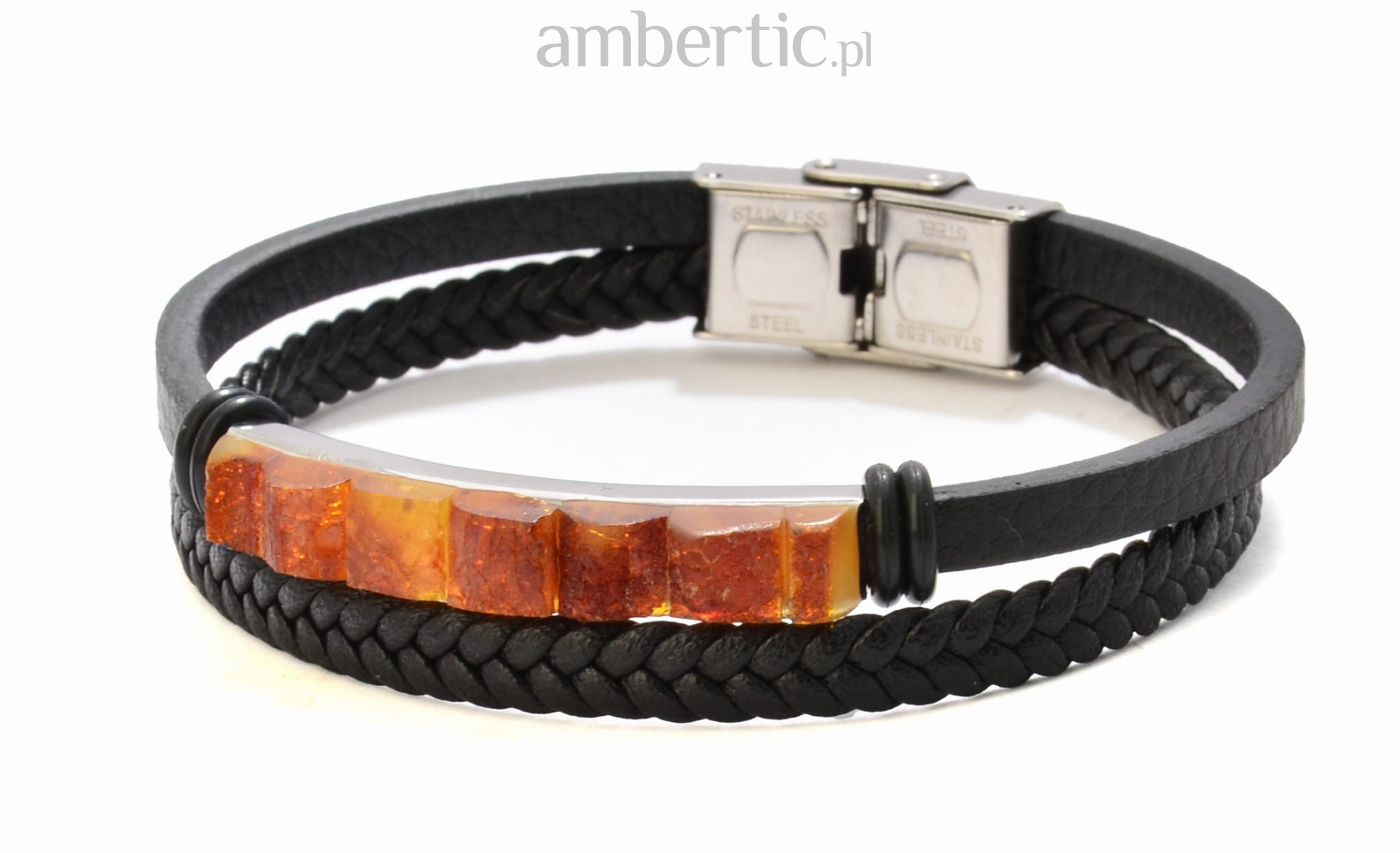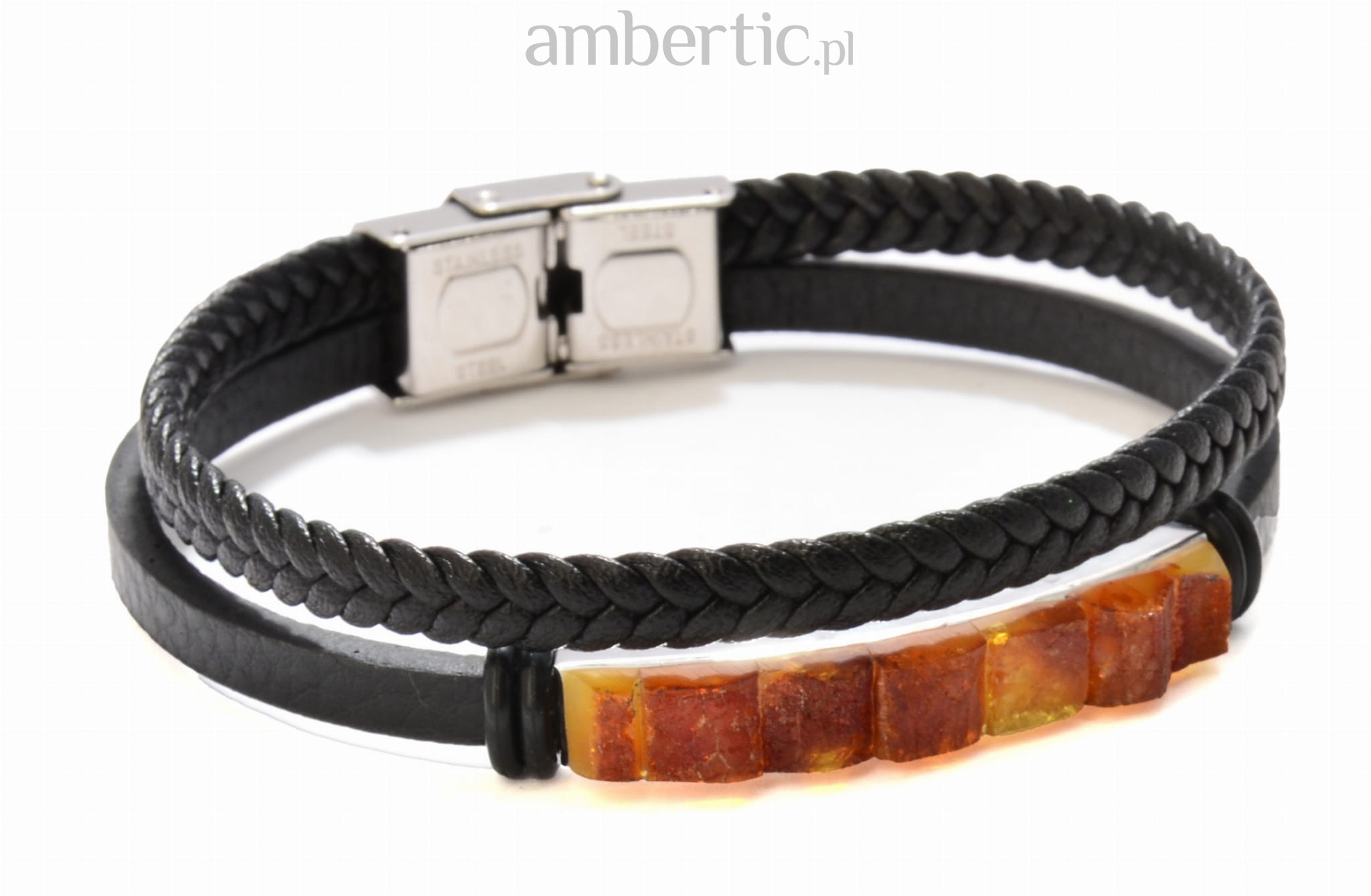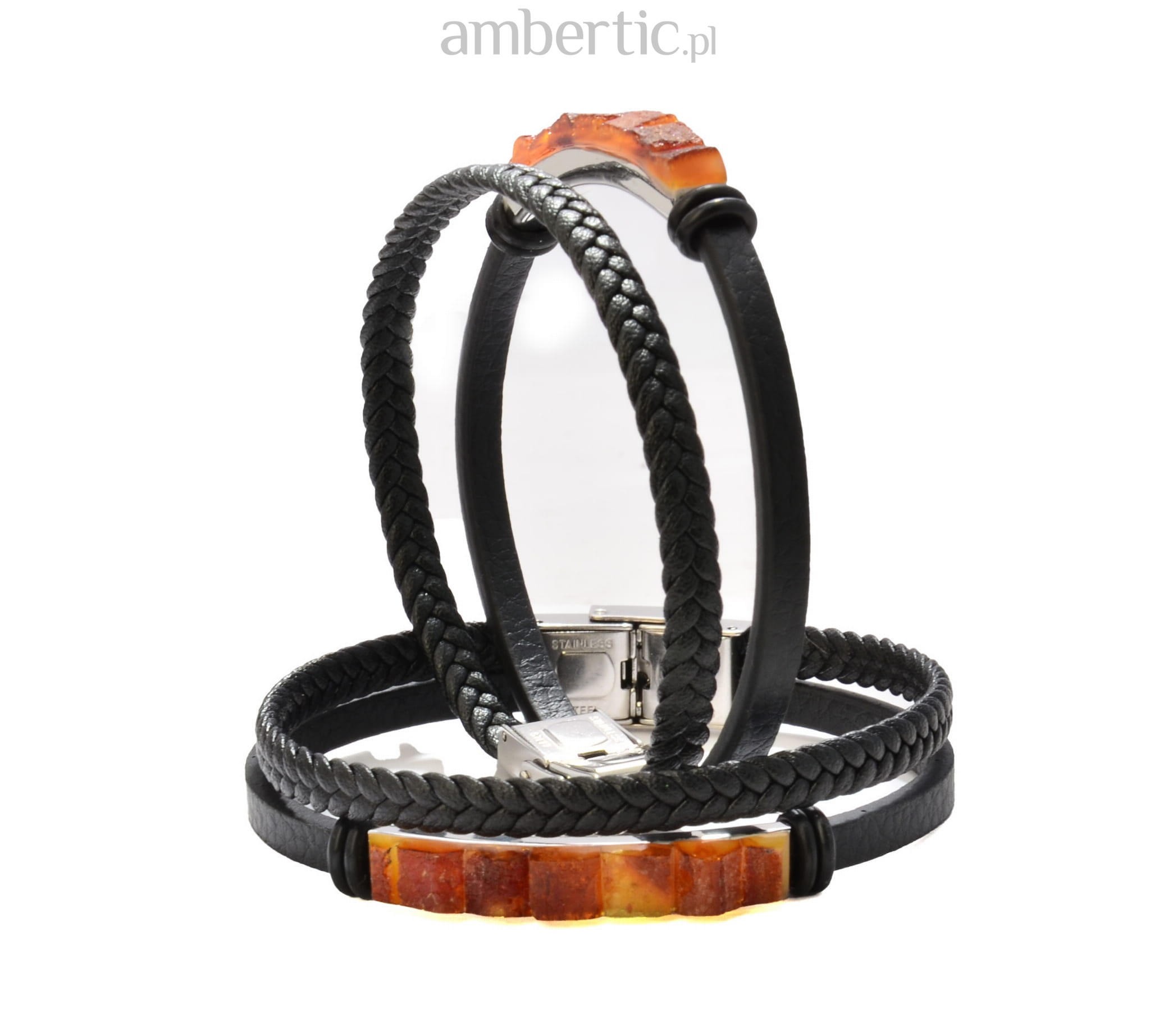 Materiał: stal szlachetna, bursztyn, skórzany pasek