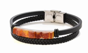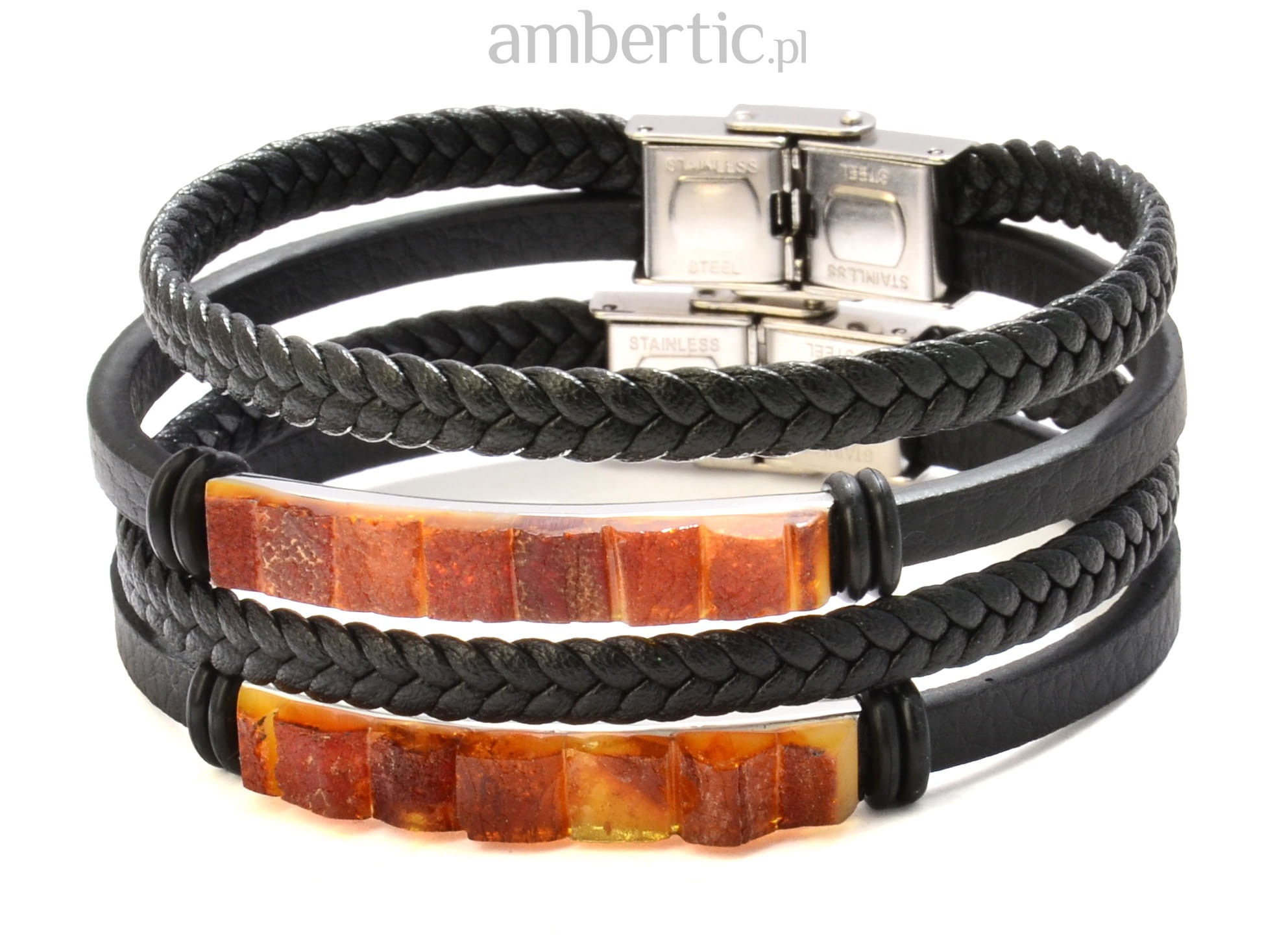 Oryginalna bransoleta męska - połączenie czarnego, skórzanego paska z mozaiką koniakowego bursztynu a także z drugim plecionym paskiem.