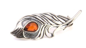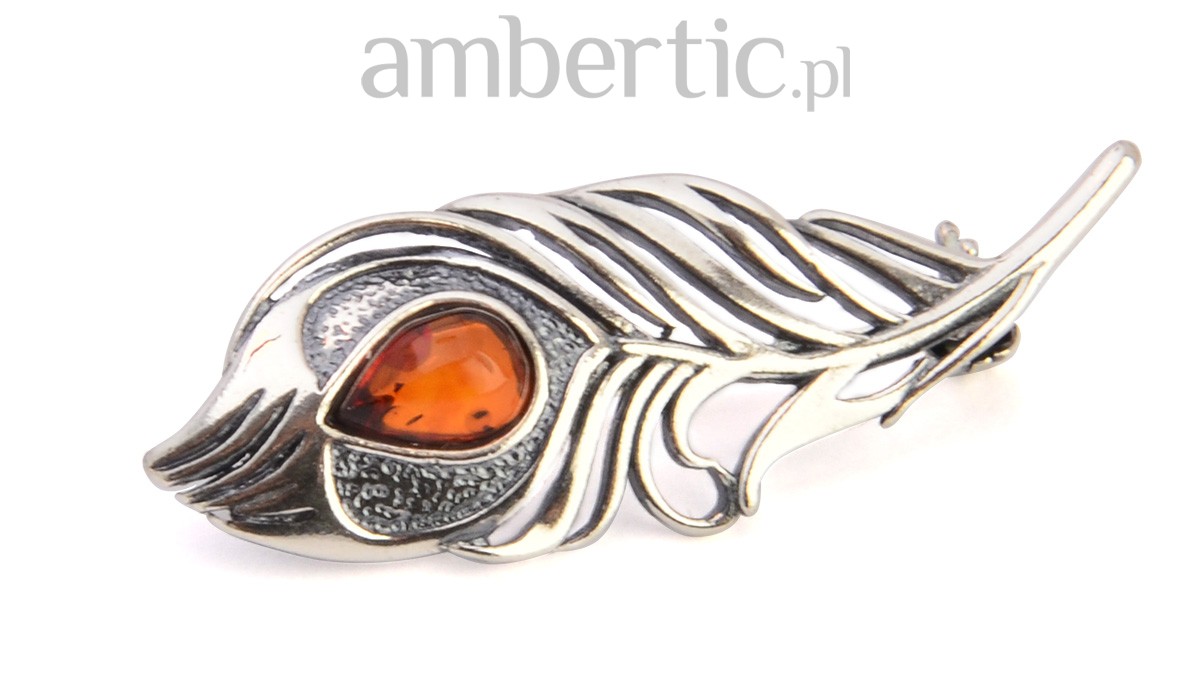 Przepiękna, niezwykle oryginalna broszka "Pawie Pióro" wykonana ze srebra najwyższej próby, udekorowanego łezką bursztynu w kolorze koniakowym.