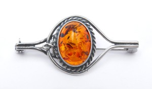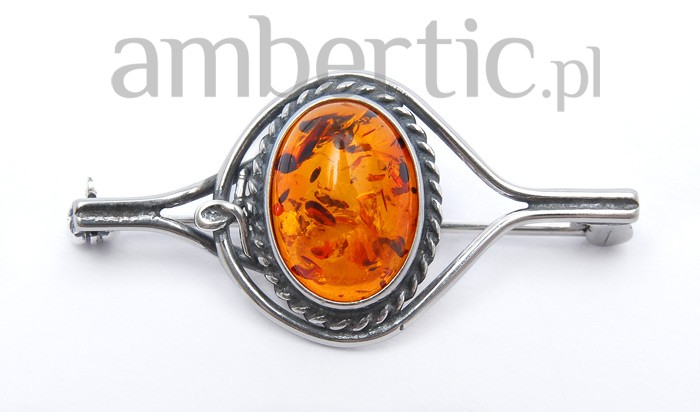 Elegancka i niezwykle oryginalna broszka wykonana z najwyższej próby srebra, finezyjnie zaplecionego wokół bursztynu w kolorze koniakowym.