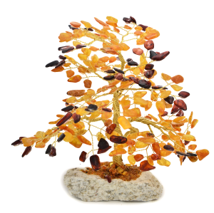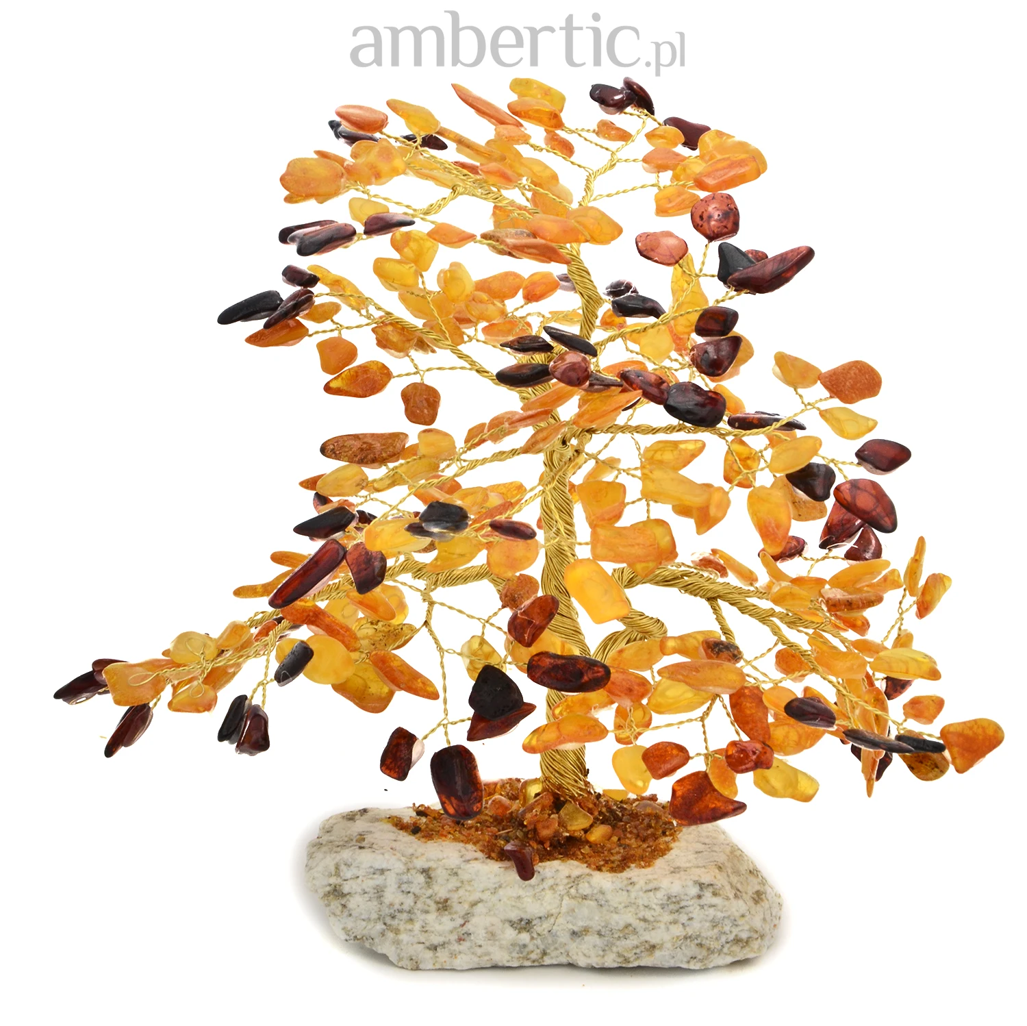 Piękne, ręcznie robione drzewko szczęścia wykonane z pozłacanego drutu ozdobionego "listkami" naturalnego bursztynu w kolorze cytrynowym i koniakowym.
