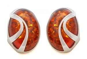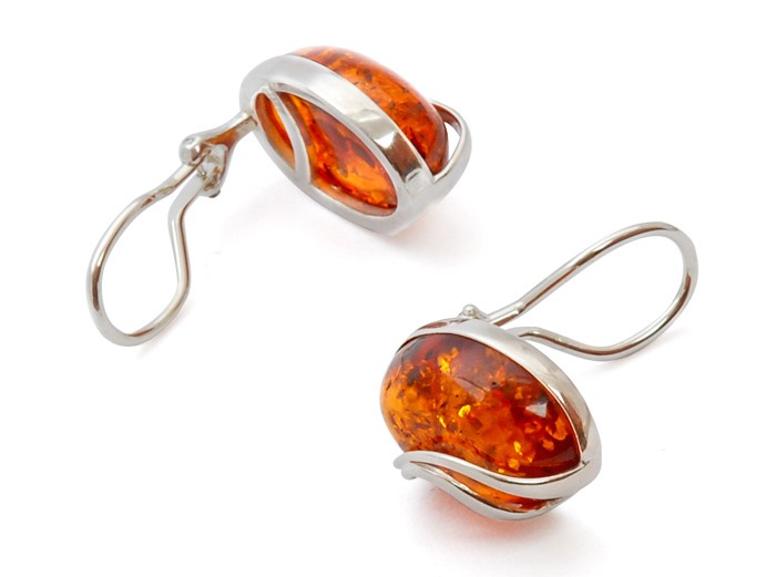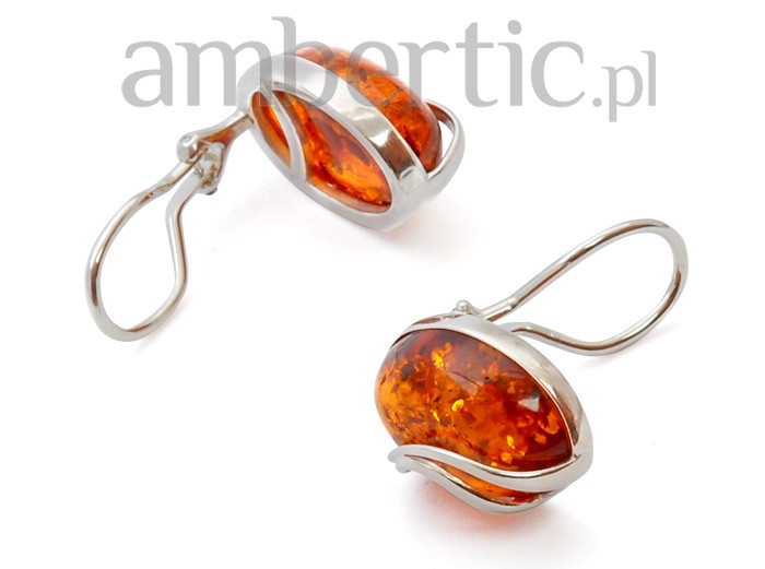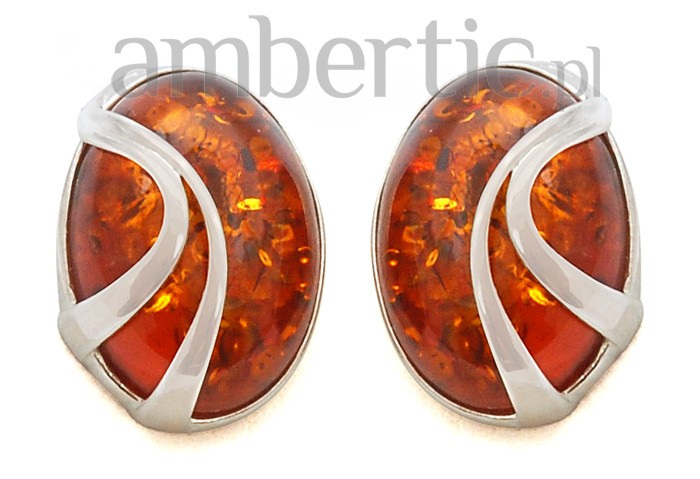 Szykowne klipsy wykonane z naturalnego bursztynu bałtyckiego w kolorze koniakowym oprawionego w najwyższej próby srebro.