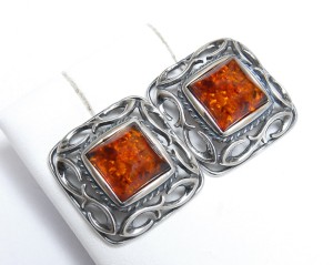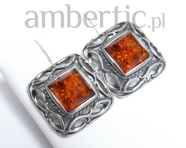 Przepiękne kolczyki wykonane z naturalnego bursztynu bałtyckiego w kolorze koniakowym ozdobione plecionką srebra najwyższej jakości.