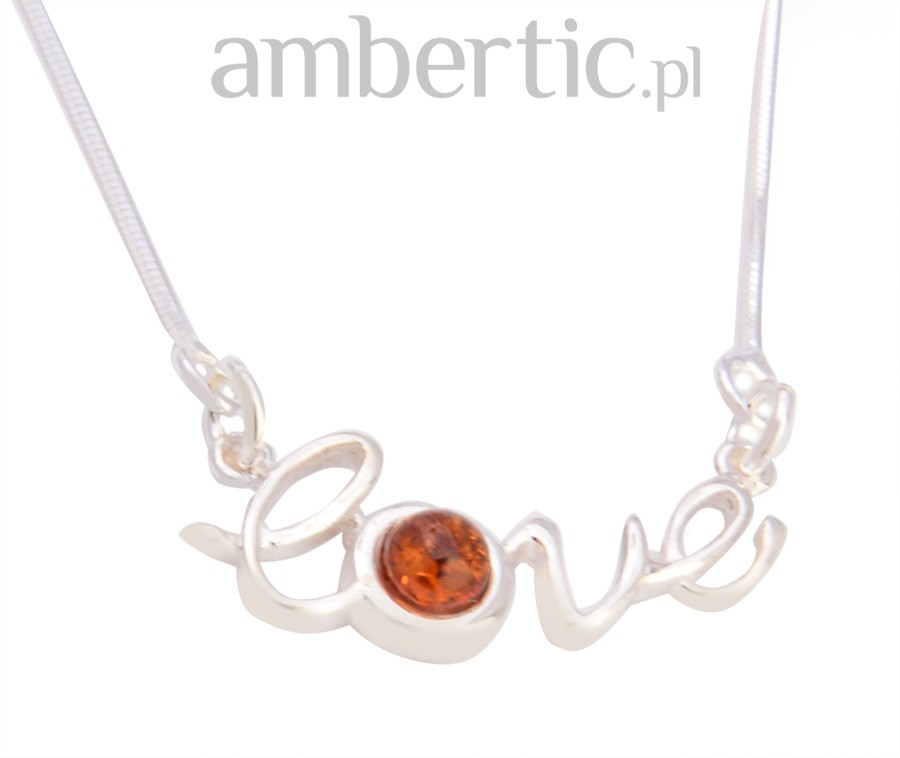 Delikatny, modny naszyjnik z napisem 'love', wykonany ze srebra najwyższej jakości oraz bursztynowego oczka w kolorze koniakowym.