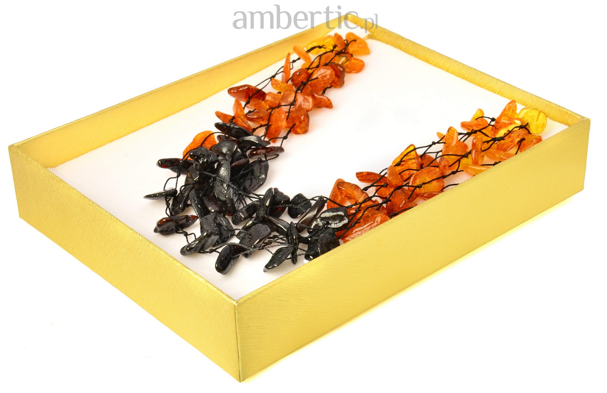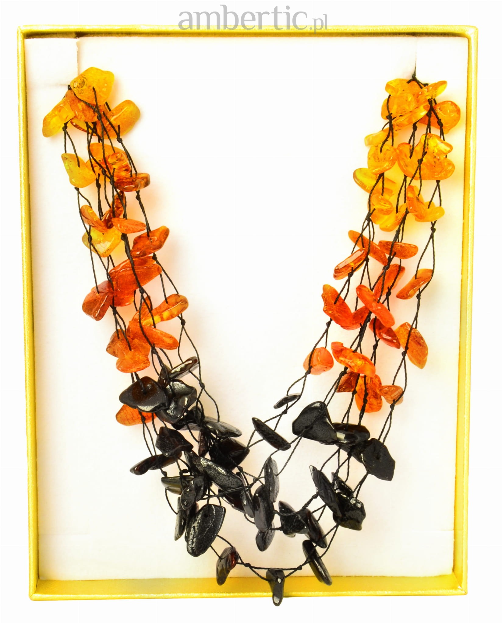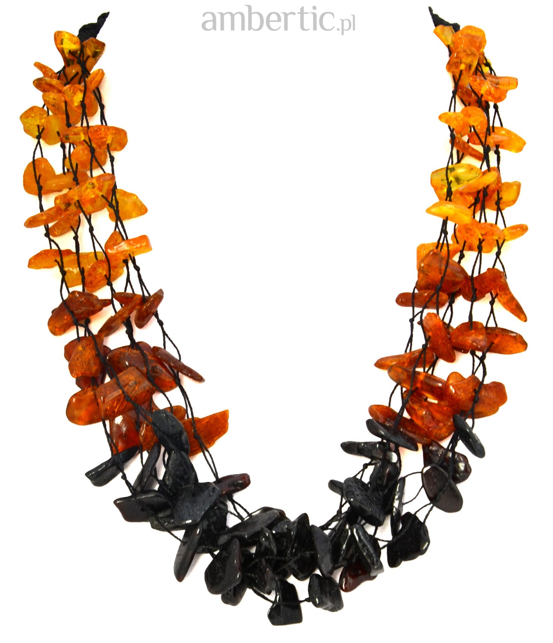 Przepiękny naszyjnik wykonany z bryłek bursztynu w kolorach: koniakowym, wiśniowym i cytrynowym nanizanych na czarny sznurek tak.  Bursztyny umieszczone na naszyjniku układają się w piękny gradient, przechodząc płynnie od jasnego, cytrynowego bursztynu, przez zmysłowy koniakowy, aż po głęboki, wiśniowy odcień. Czarny sznurek podkreśla intensywność kolorów bursztynu i dodaje naszyjnikowi nowoczesnego charakteru. Naszyjnik prezentuje się niezwykle efektownie.