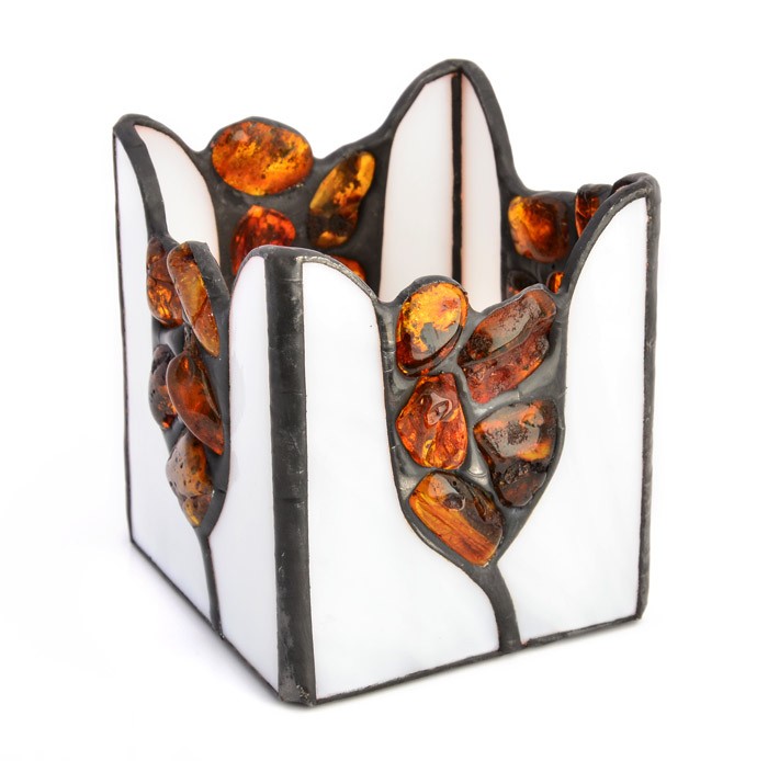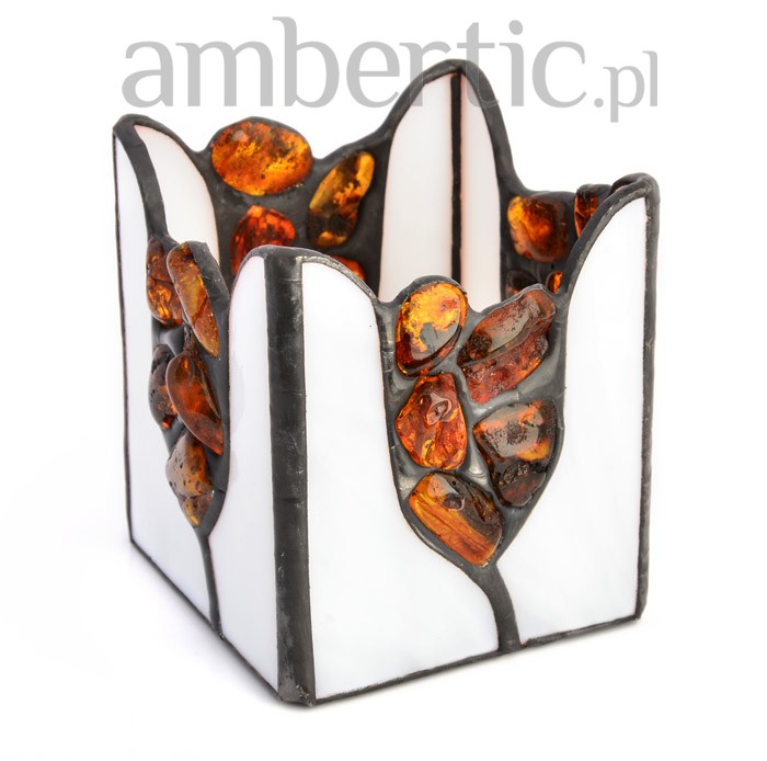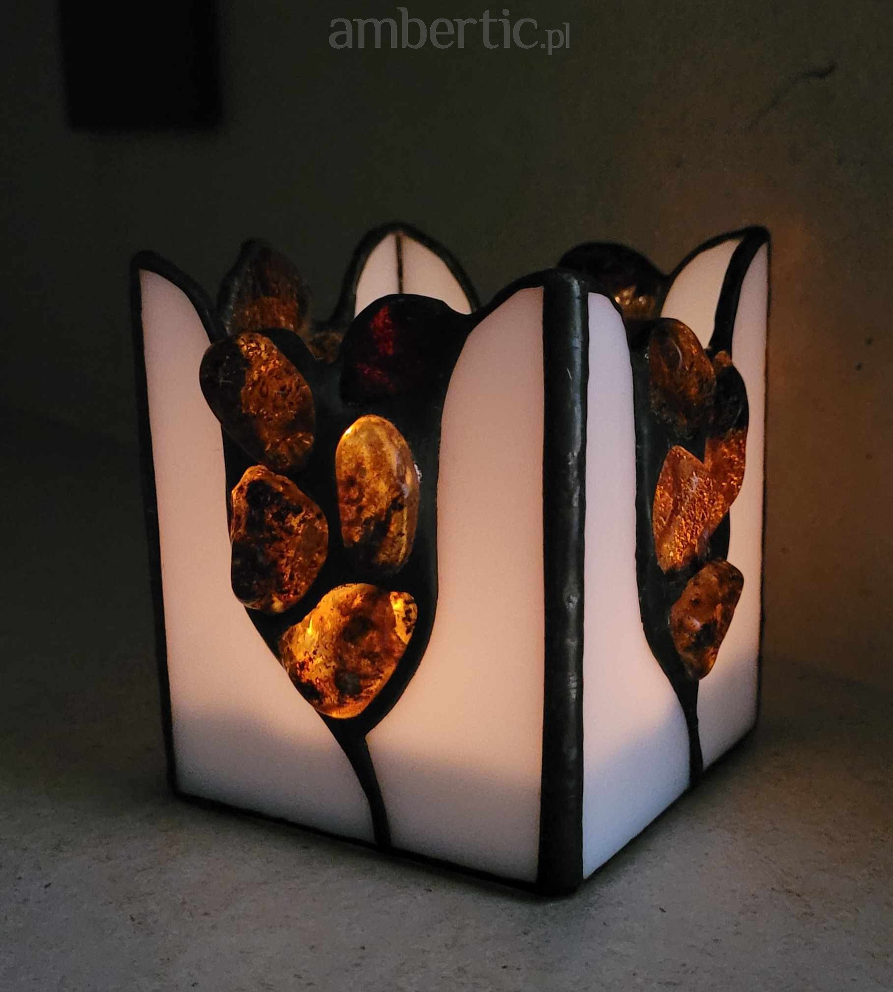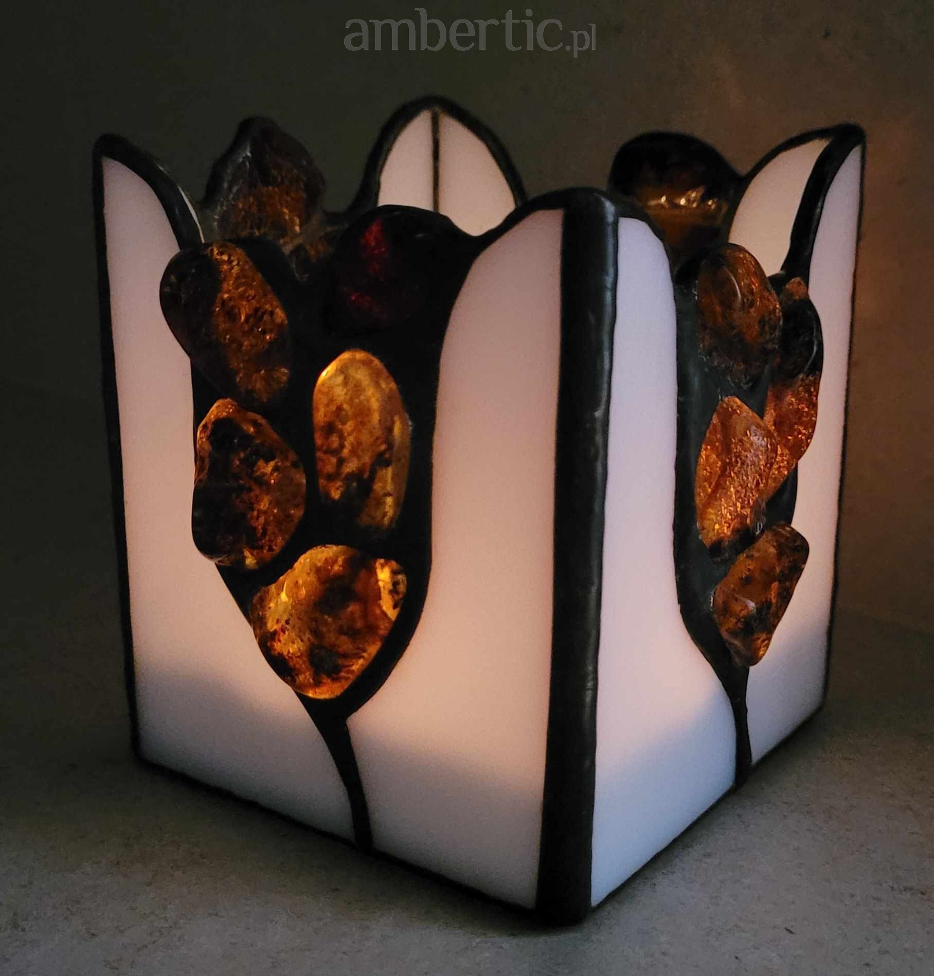 Przepiękny świecznik/lampion wykonany z mlecznego szkła witrażowego połączonego cyną i udekorowanego bryłami naturalnego bursztynu w kolorze koniakowym.