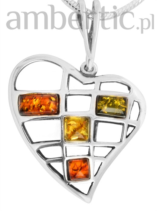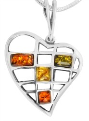 Przepiękny i niezwykle oryginalny wisior w kształcie serca wykonany z najwyższej próby srebra ozdobionego kwadratami bursztynu bałtyckiego w kolorach: koniakowym, cytrynowym i zielonym.