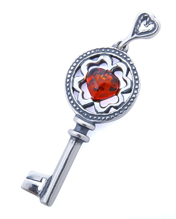 Niepowtarzalny, niezwykle modny wisiorek "Klucz" wykonany ze starannie zdobionego srebra najwyższej jakości ozdobionego serduszkiem bursztynu bałtyckiego w kolorze koniakowym.