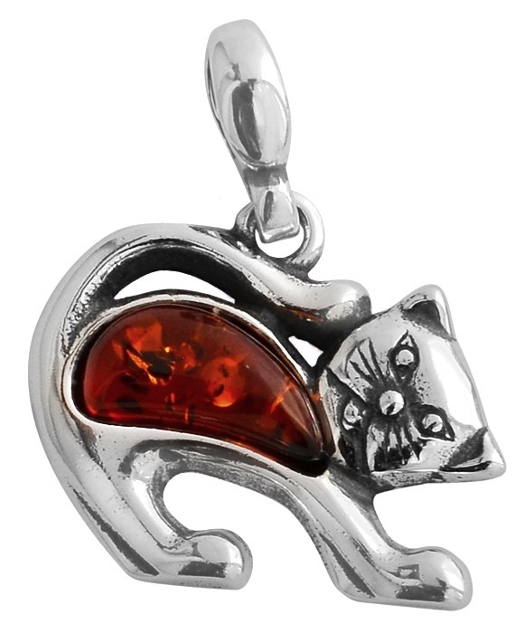 Zabawny wisiorek "Kotek" wykonany z najwyższej jakości srebra ręcznie zdobionego i udekorowanego naturalnym bursztynem bałtyckim w kolorze koniakowym.