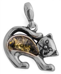 Zabawny wisiorek "Kotek" wykonany z najwyższej jakości srebra ręcznie zdobionego i udekorowanego naturalnym bursztynem bałtyckim w kolorze zielonym.