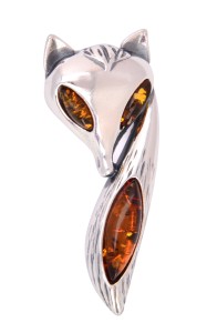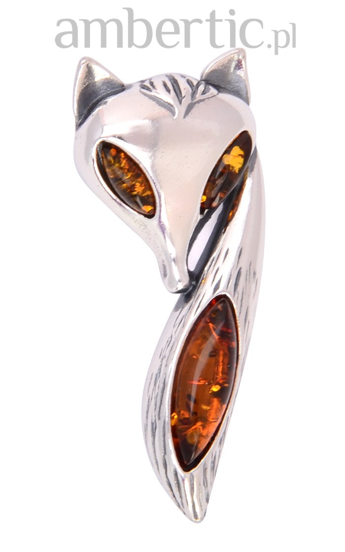 Uroczy wisior "Lisek" wykonany ze srebra o próbie 925 udekorowanego soczewkami bursztynu w kolorze koniakowym.