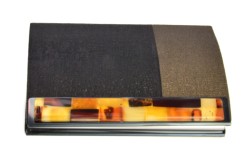 Pomysł na wyjątkowy i niezwykle elegancki prezent - ekskluzywny wizytownik starannie wykonany ze stali szlachetnej pokrytej skórką ekologiczną w kolorach: czarnym i brązowym i zdobionej pasem przepięknej bursztynowej mozaiki w kolorach: wiśniowym, koniakowym, cytrynowym i mlecznym.